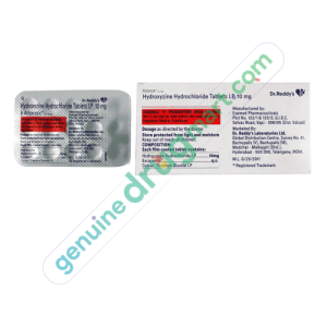 Hydroxyzine 10mg is an antihistamine drug that is used to relieve anxiety and tension. It works by decreasing the effects of histamine, a naturally occurring chemical, in your body. With anticholinergic and sedative properties, it is also used to treat allergic conditions of the skin such as rashes, hives, and itching, as well as used before and after surgery. Besides, Hydroxyzine is used to control nausea and vomiting. This medicine may also be used to treat other conditions as determined by your doctor.