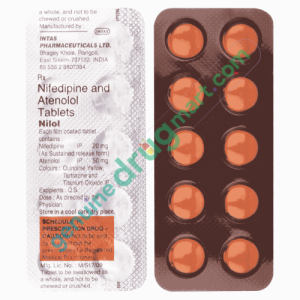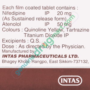 Nifedipine–Atenolol 20mg-50mg is an oral medicine used in the treatment of angina and hypertension. It is a combination medication that contains Nifedipine (calcium-channel blocker) and Atenolol (beta blocker). Nifedipine works by relaxing the blood vessels of the heart; Atenolol works by blocking the effects of certain chemicals in the body. This medicine may also be used to treat other conditions as determined by your doctor.