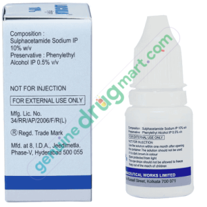 Sulphacetamide/Sulfacetamide 10% Eye drops 10ml is a sulfonamide antibiotic used in the treatment of bacterial infections of the eyes. It stops the growth of bacteria that cause certain eye infections such as conjunctivitis. This medicine may also be used to treat other conditions as determined by your doctor.