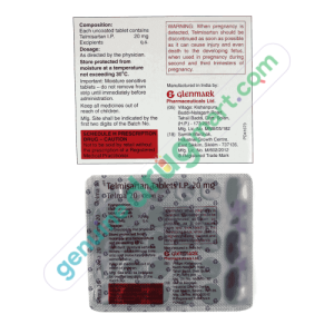 Telmisartan 20mg is used to treat high blood pressure (hypertension). It is in a group of drugs called angiotensin II receptor blockers. Telmisartan works by blocking a substance, angiotensin, thereby relaxing blood vessels. This action lowers the blood pressure and increases the supply of blood and oxygen to the heart. Reduction of high blood pressure helps prevent strokes, heart attacks, and kidney problems. This medicine may also be used to treat other conditions as determined by your doctor.