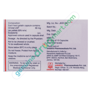 Orlistat 60mg Capsules is a lipase inhibitor used to promote weight loss in obese people who have a body mass index (BMI) of 30kg/m² or more. This medication is also prescribed to treat obesity in overweight people who may have elevated blood cholesterol, high blood pressure, heart disease, and diabetes. It prevents the digestion and absorption of fat from the food you eat, and this undigested fat is eliminated in stools from the body. This medicine may also be used to treat other conditions as determined by your doctor.